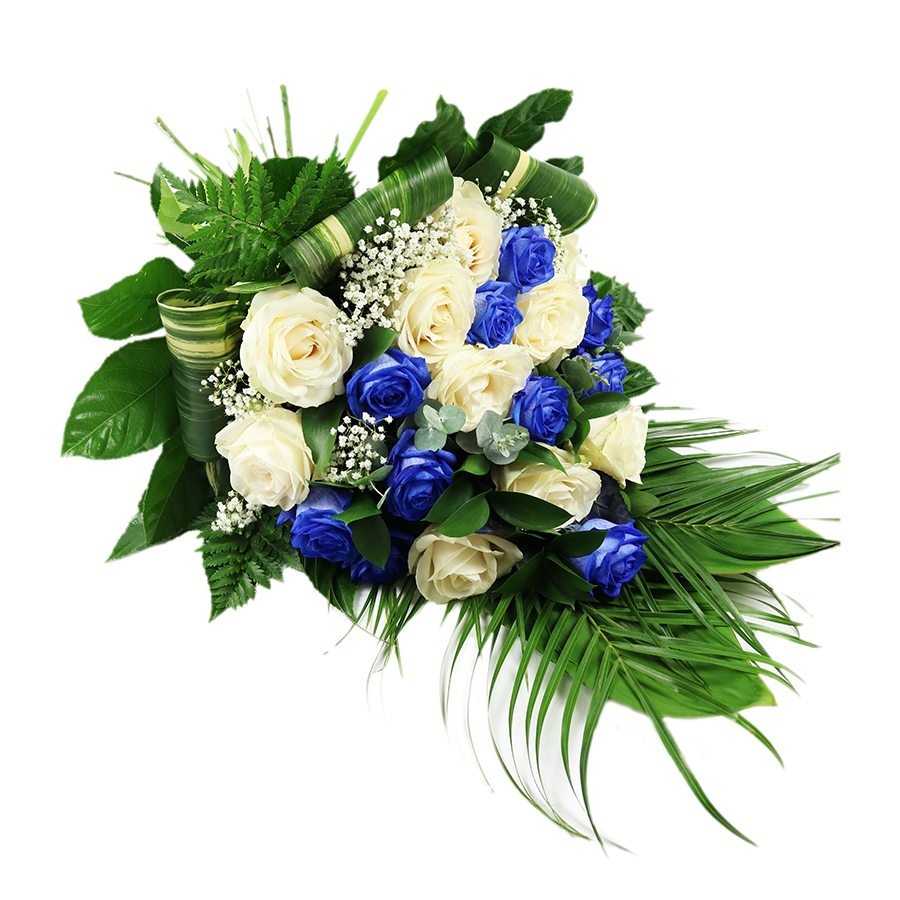 Express your heartfelt sympathy with our elegant spray bouquet featuring white and blue roses. This unique arrangement is thoughtfully designed to convey comfort and grace.