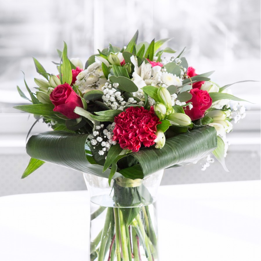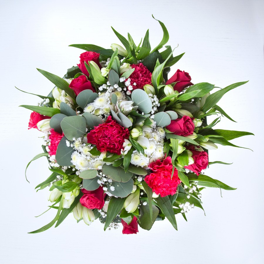 Celebrate every moment with our stunning flower arrangement that showcases a harmonious mix of vibrant hues and premium blooms. This bouquet includes sweet white chrysanthemums, airy gypsophila, passionate red roses, and elegant carnations, artistically paired with white alstroemeria and rich aspidistra leaves.