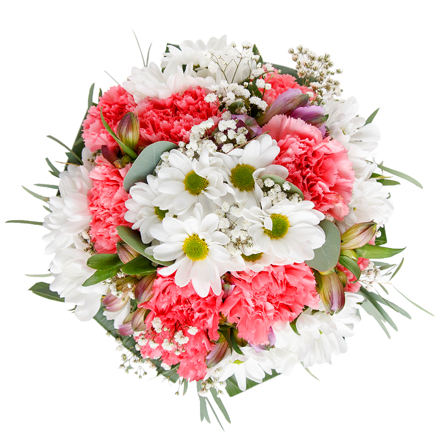Present a timeless elegance with our seasonal floral bouquet. This arrangement features a beautiful combination of snow-white chrysanthemums, delicate gypsophila, and light pink carnations, elegantly wrapped in rich aspidistra leaves for a sophisticated look.